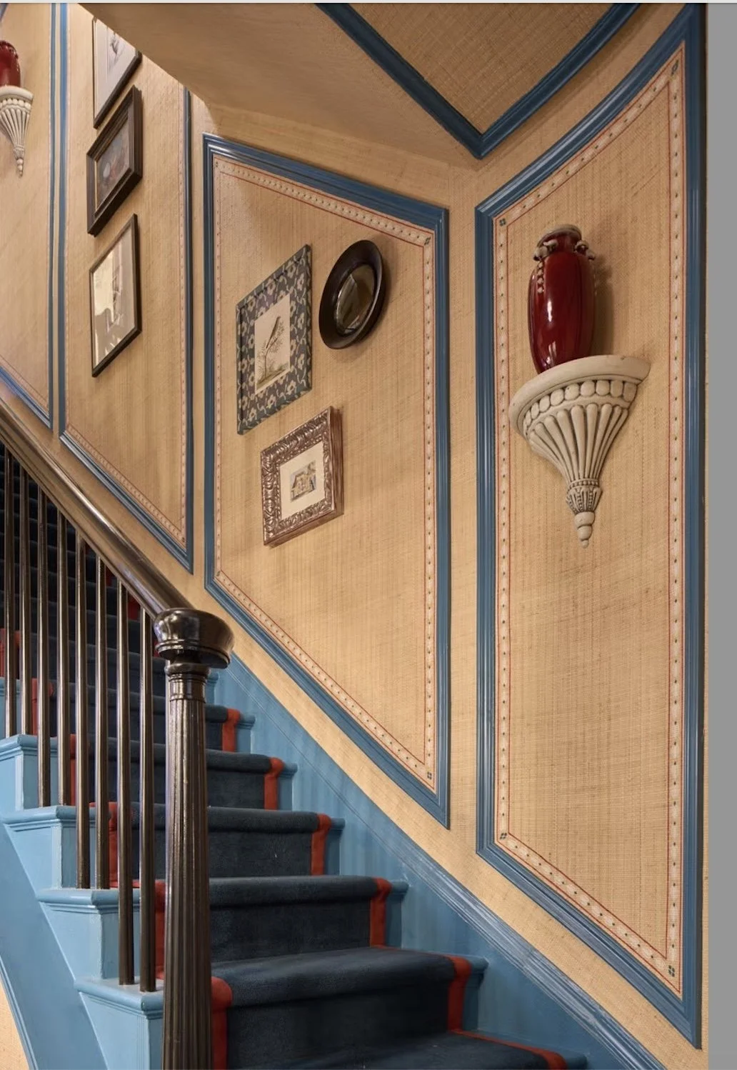 Inspired by golden hour in Ravello, Thomas stuck to a palette of rich blues, deep terracotta accents, and creamy neutrals, with shades pulled from weathered tile, antique Roman olive jars, and wild lemon trees. Phillip Jeffries' grasscloth adorned with custom moldings and hand-stenciled patterns, paired with a custom Stark runner, envelopes the space. I adore Philip Jeffries’ wallpaper and used it with passion in more than a few of our rooms. It’s pure magic. In any of his designs.
