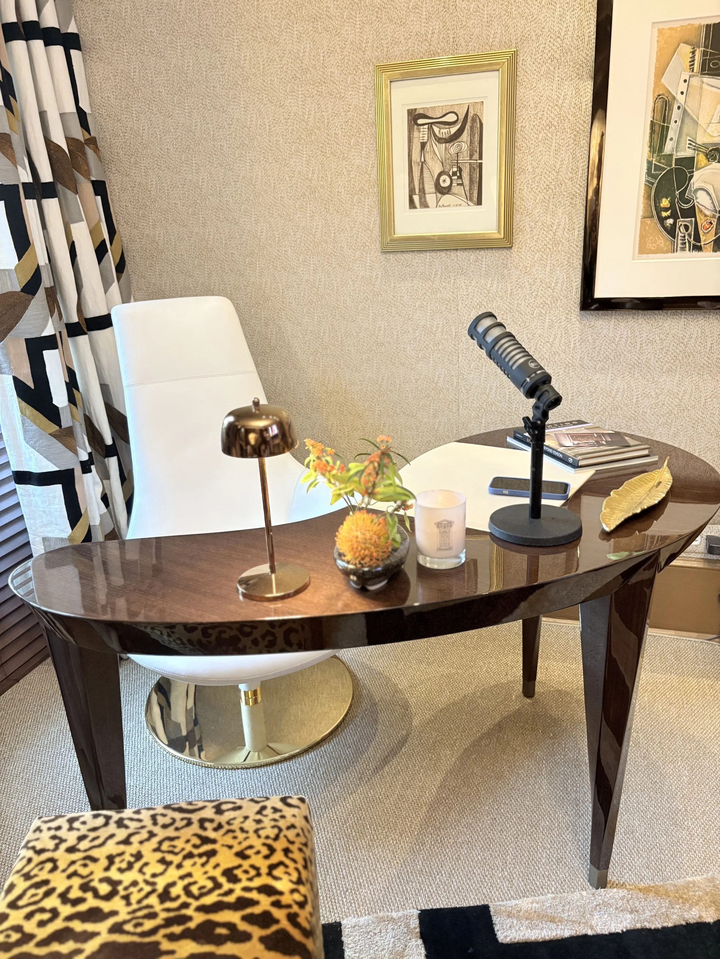 The Rousseau inspired walls wrap you in an artful, dreamy forest. Organic shapes of the sitting area and desk. Oh, those gold pedestal legs, “brick” rug, animals, a bar (!), and shimmery window treatments! The composition gave me a feeling of being in nature that was both opulent and spare at the same time. I yearned to sit down and start writing in this very luxurious room.