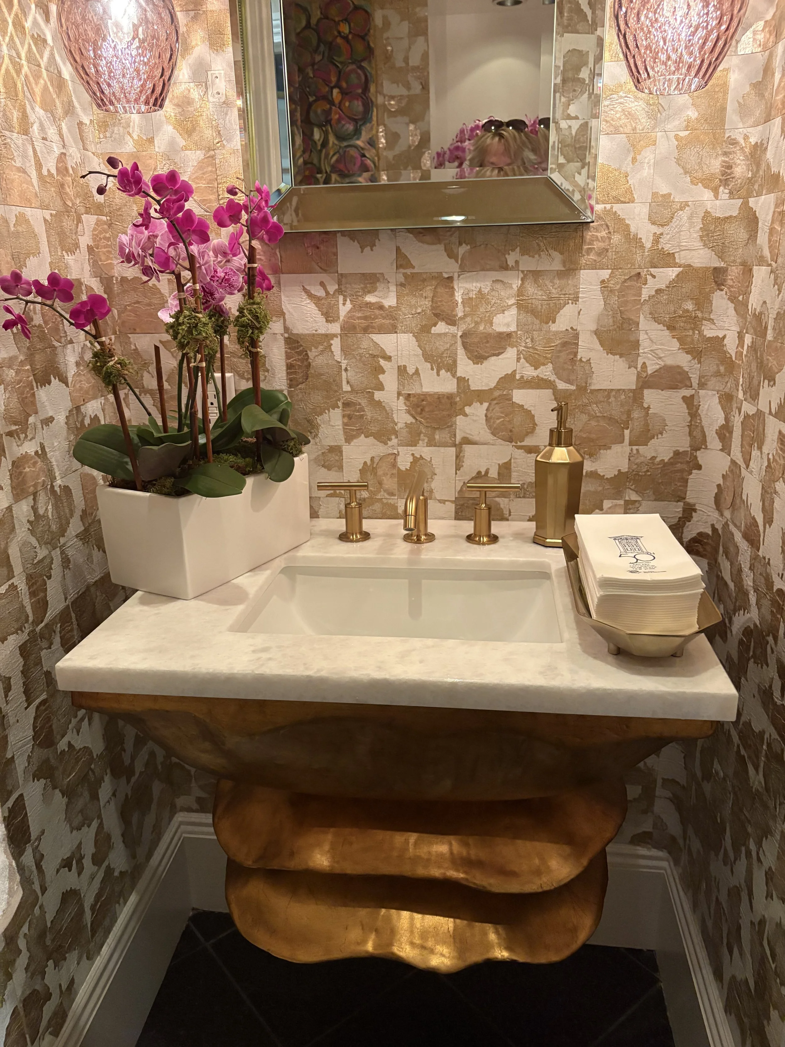 French gold plumbing fixtures by Kohler add another dazzling layer to the space. Throughout, soft neutrals let metallic accents shine.