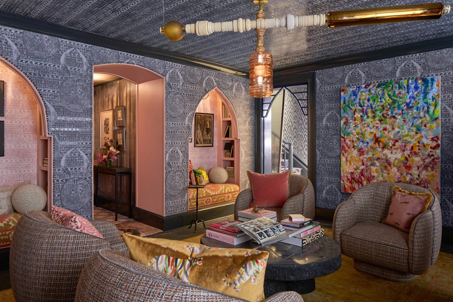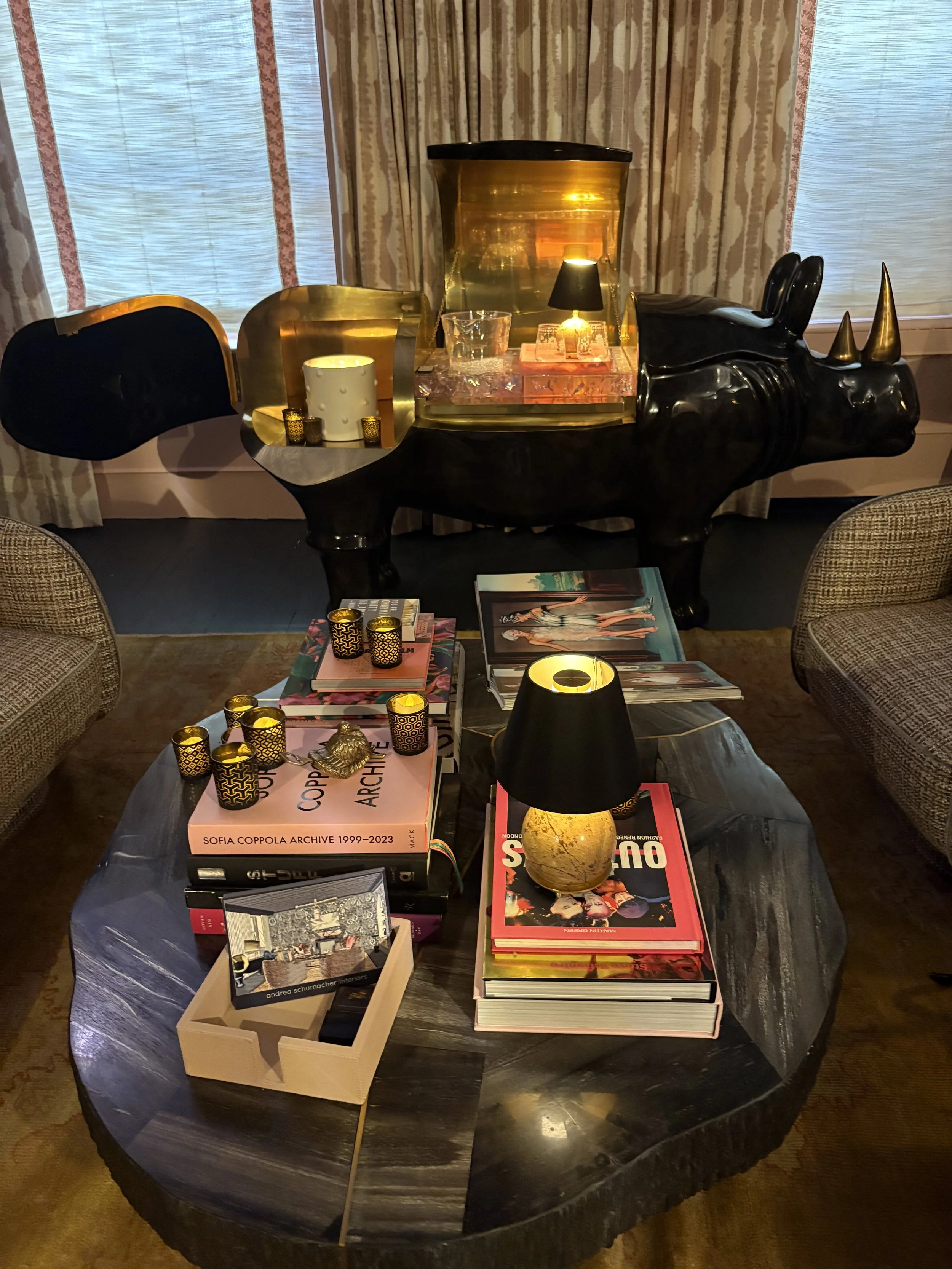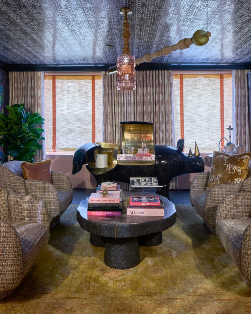 The animal narrative continues in Andrea Schumacher’s mischievous Front Parlour~Pink Rhino Club Room where Sylvan’s charcoal resin rhino—a nod to the iconic Lalanne—perches atop a Rug & Kilim antique coral-toned Ushak. Schumacher carried the midnight blue theme forward with custom wallpaper adapted from scanned African-inspired emblems created by her grandmother. The effect is both personal and powerfully atmospheric.
