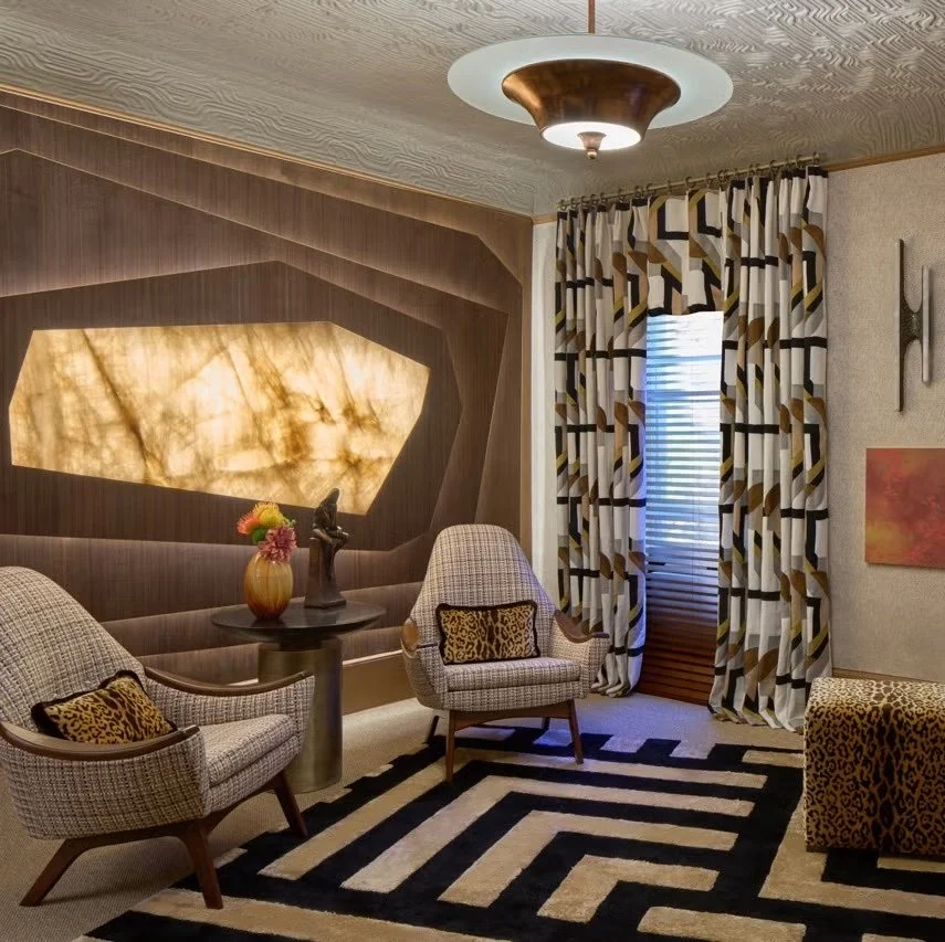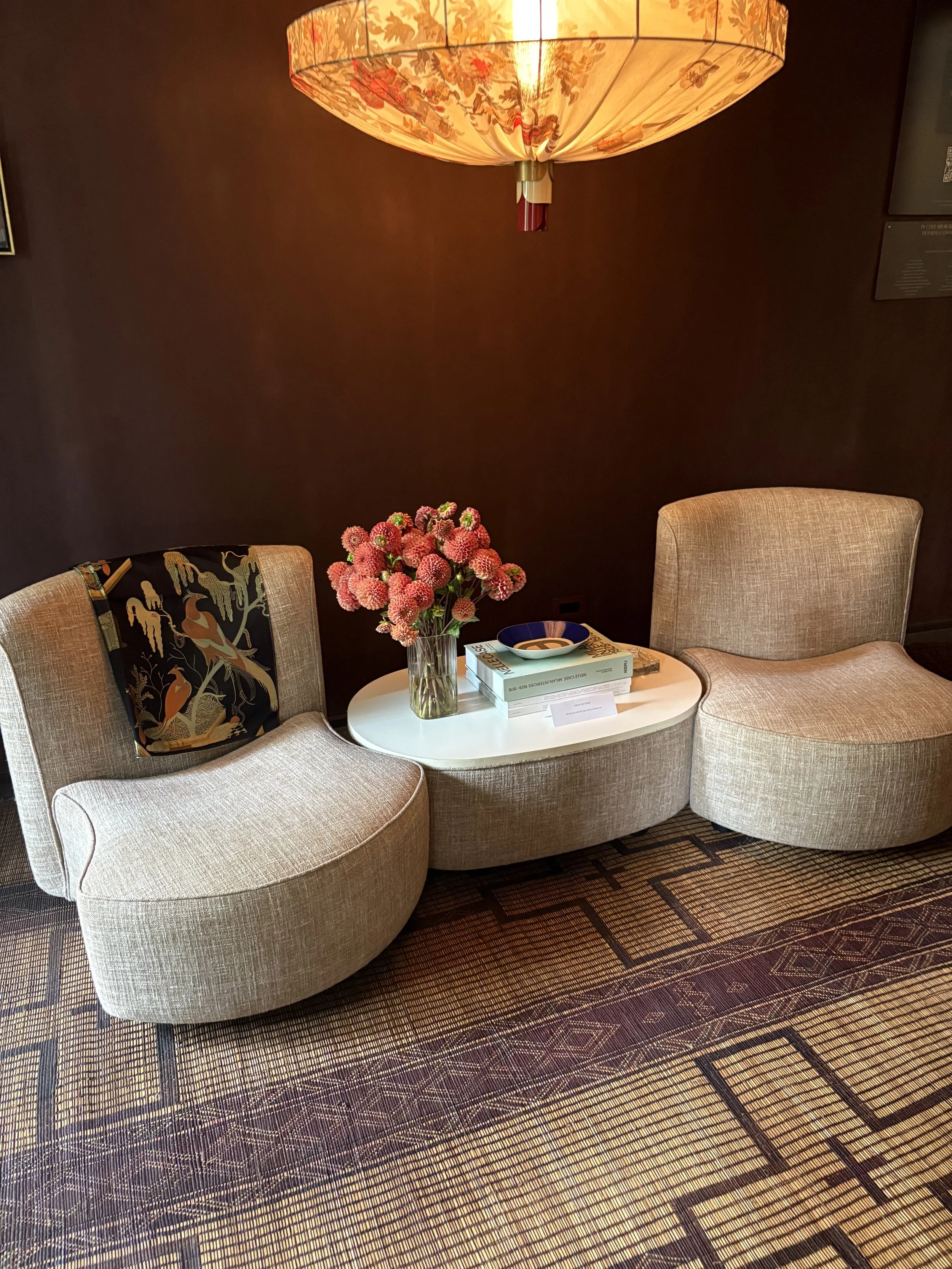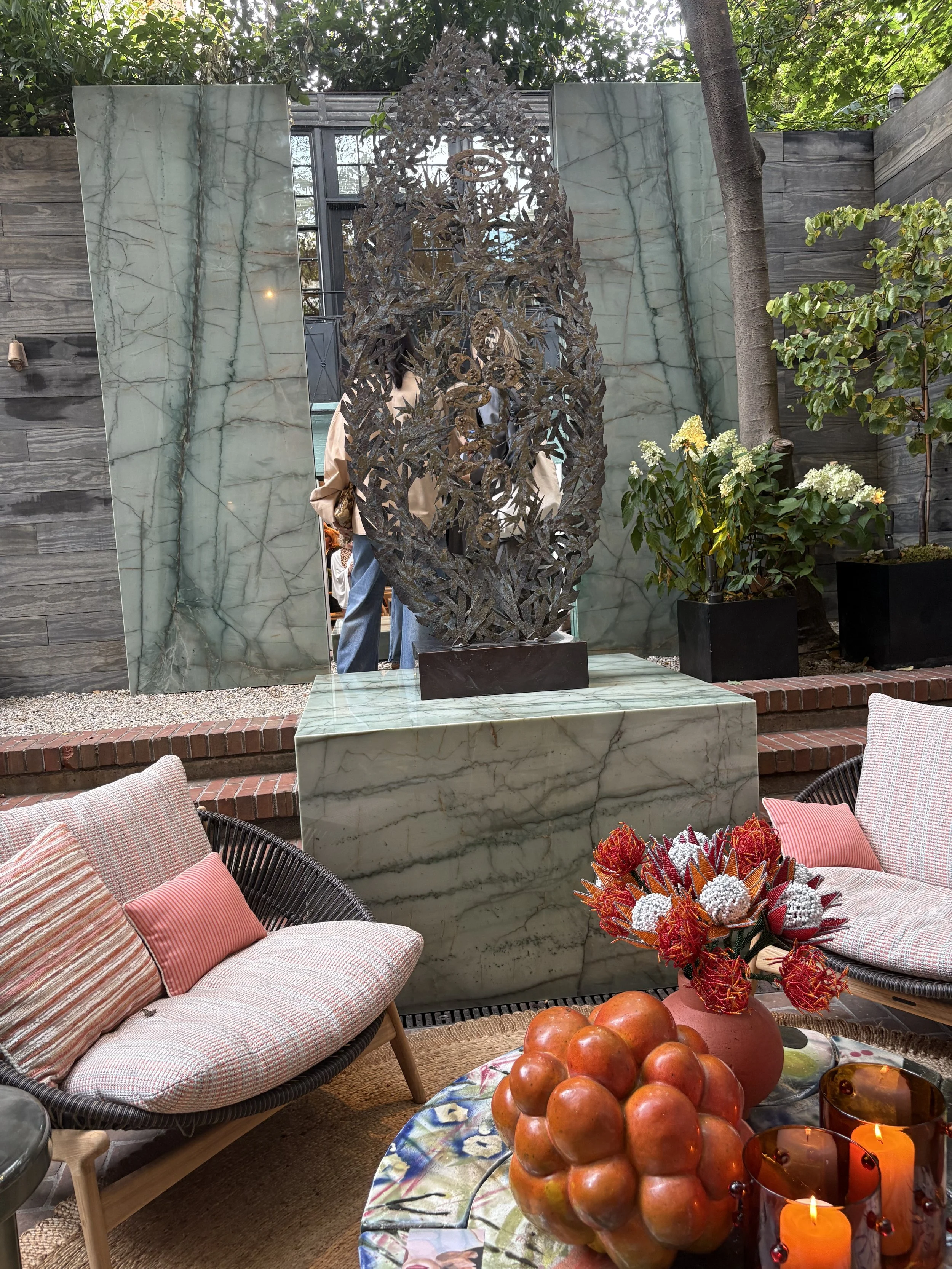 The animal narrative continues in Andrea Schumacher’s mischievous Front Parlour~Pink Rhino Club Room where Sylvan’s charcoal resin rhino—a nod to the iconic Lalanne—perches atop a Rug & Kilim antique coral-toned Ushak. Schumacher carried the midnight blue theme forward with custom wallpaper adapted from scanned African-inspired emblems created by her grandmother. The effect is both personal and powerfully atmospheric.