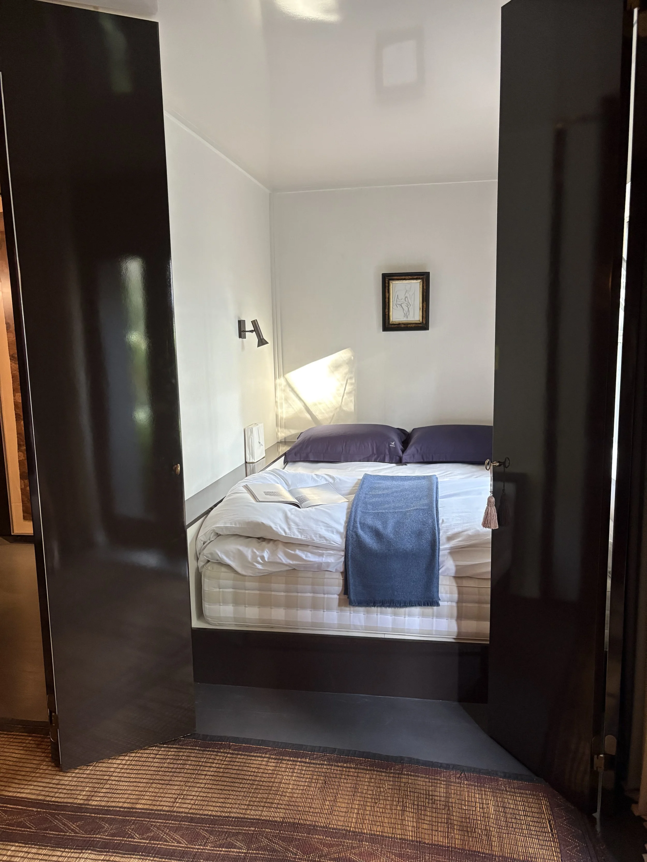 Nearby, a bed cleverly enclosed by high-gloss lacquer walls fitted with handmade solid brass hardware creates a surprisingly ample bedroom. A Vespera sconce by WDSTCK makes for a chic reading lamp.