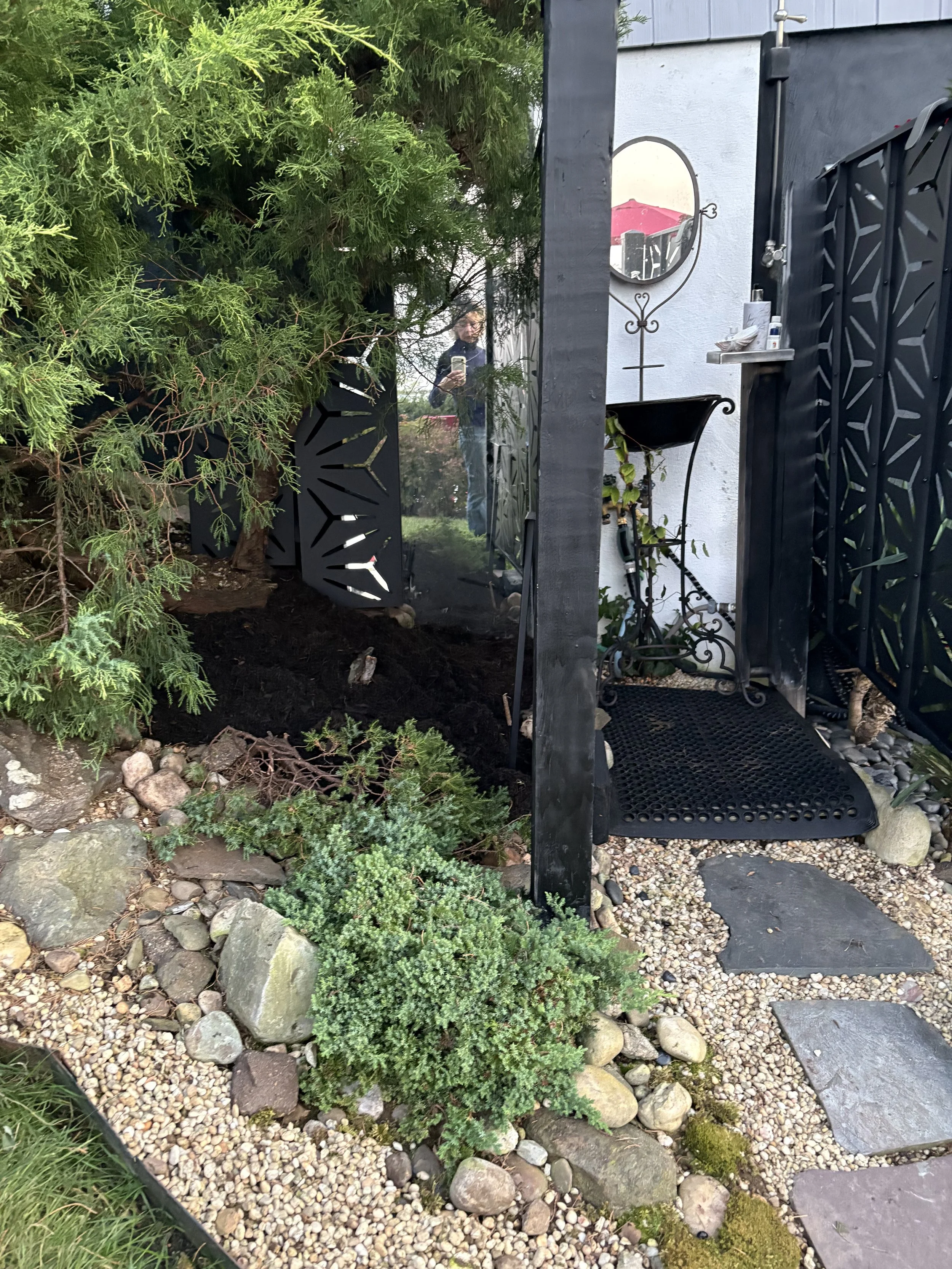 I redesigned a space at our country house next to the outdoor shower in time for the Fall Into Natives Garden tour for our Garden State community and I had the idea to repurpose a very nice mirror that had been tucked away in a corner of our garage and use it in the new garden space, next to the shower, after I removed a dying lilac.