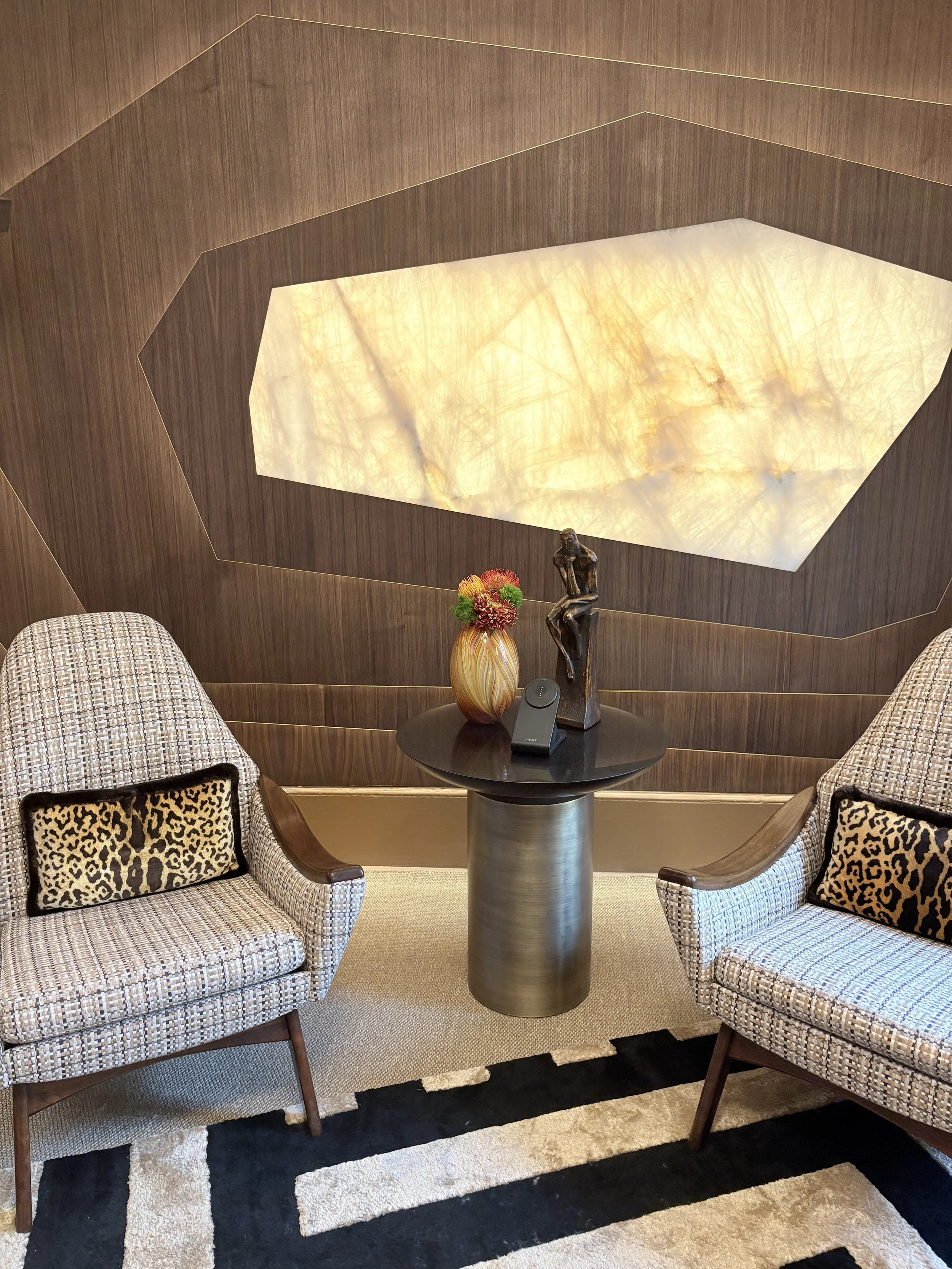 Designer Charles Pavarini III of Pavarini Design put a bespoke spin on a “Zoom Room” office by creating a custom wall work envisioned as an ideal background for video-conferencing. The striking piece combines walnut and backlit Cosentino stone, which together provide an ultra-flattering glow.