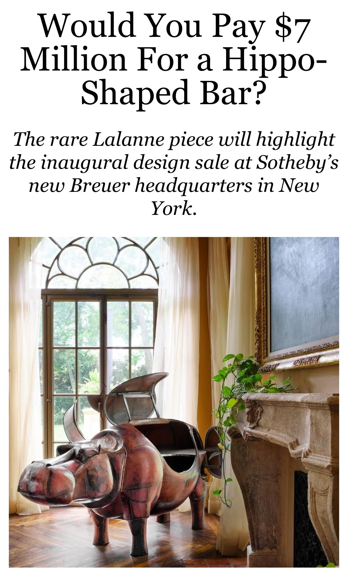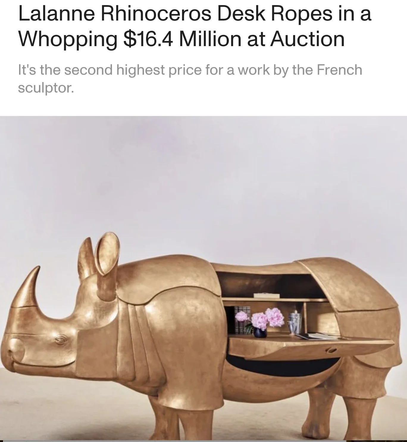 I then remembered reading that Sotheby’s sold a Lalanne rhino sculpture desk ~ not unlike the bar rhino featured in Schumacher’s parlour ~ for a whopping $16.4 million. Almost the same price as the entire Showhouse! At the time of the auction, the industry press noted, “Both François-Xavier and Claude Lalanne believed art should be a part of everyday life.” Well, la ti da. I want that everyday life. 😝