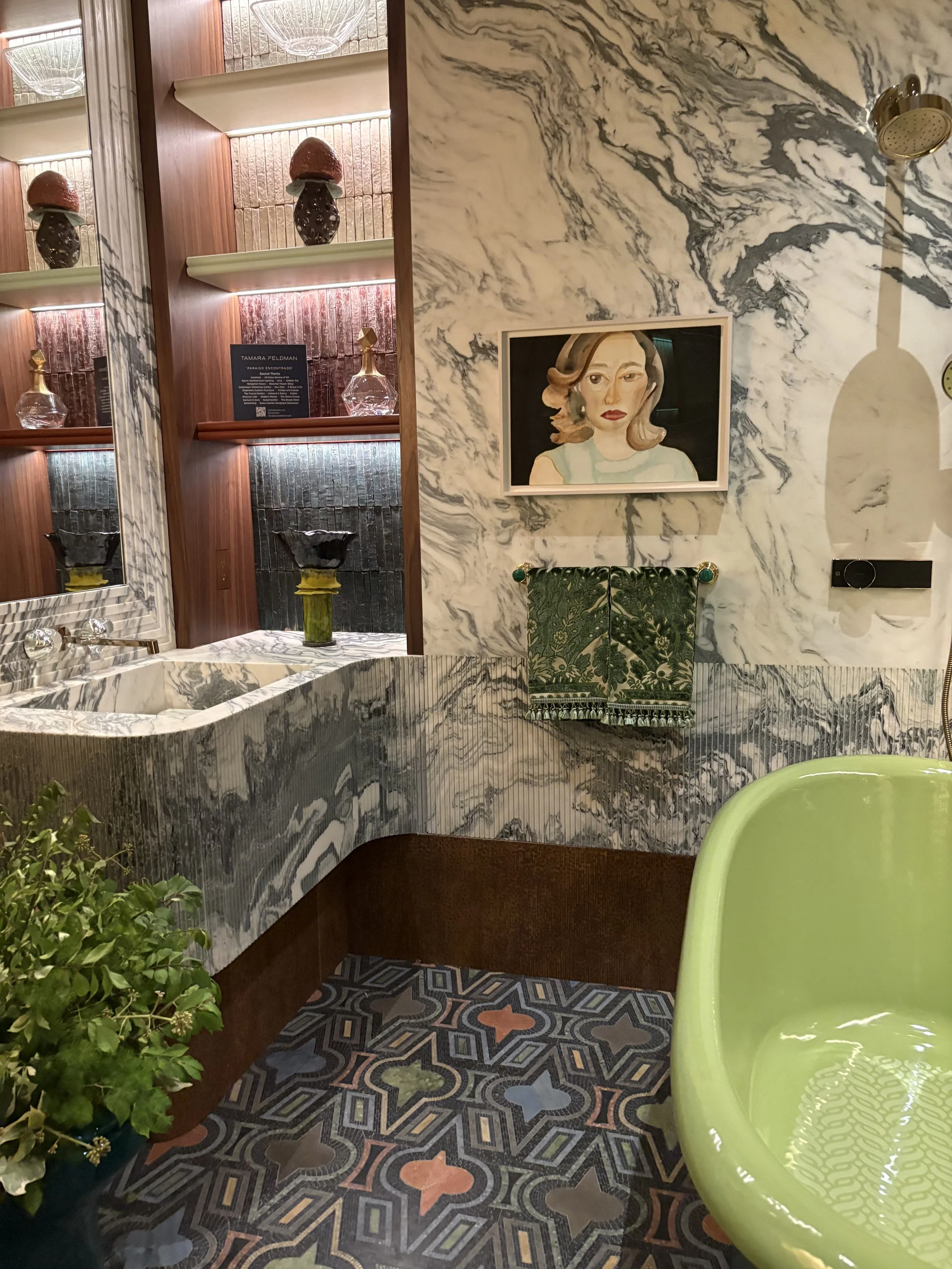 Now, those colors have become the signature of the showhouse bathroom she designed. In crafting the space, Feldman took her cues in particular from the home of one of the film’s central characters, Nora Dinsmoor, played by Anne Bancroft, channeling it in all its layered, green glory.