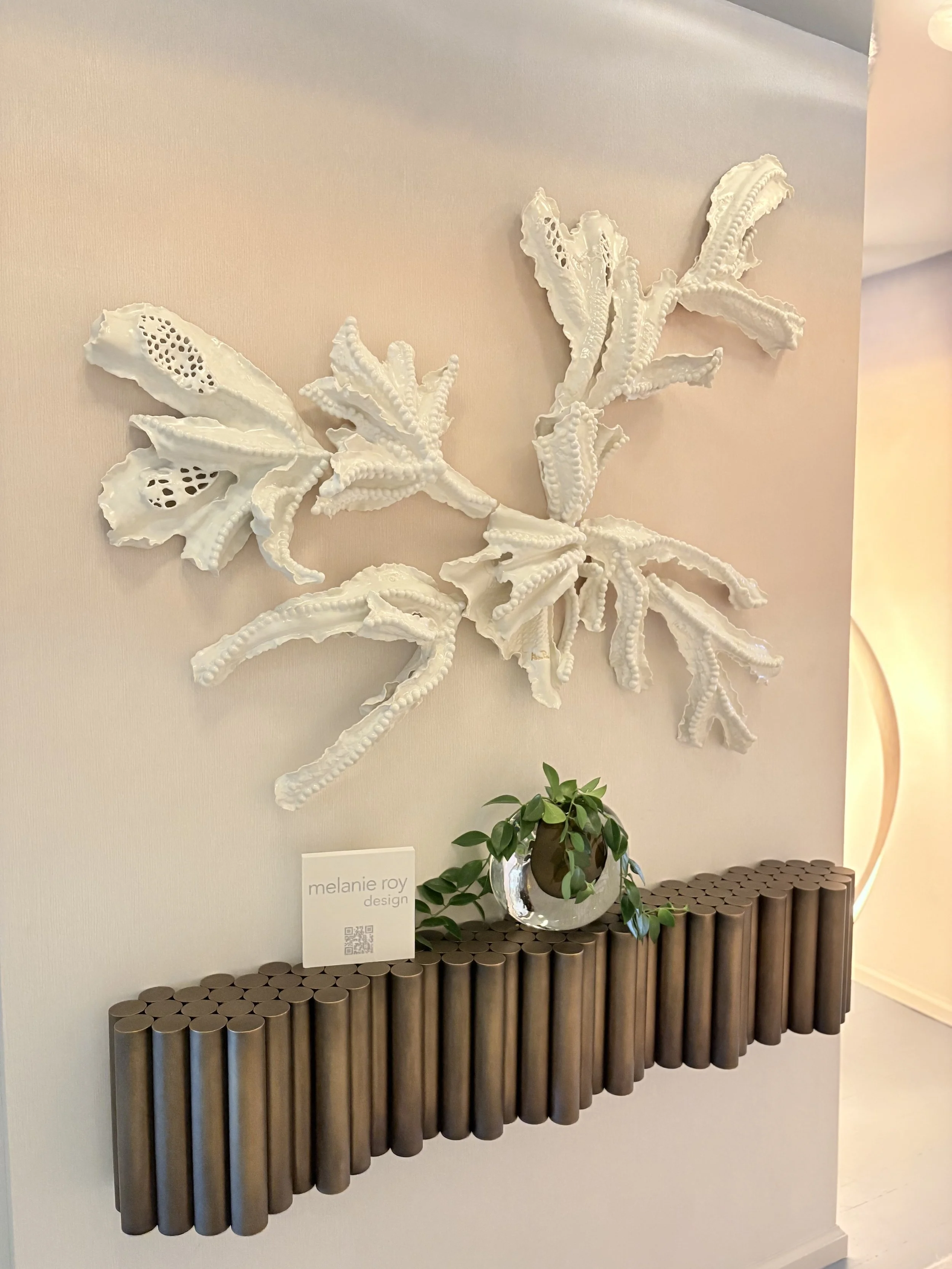 Melanie Roy goes avant-garde for her Kips Bay Decorator Show House bathroom design. The space is a play on the intersection of light and nature and was inspired by Michael Aram’s three-dimensional orchid tile for Artistic Tile.