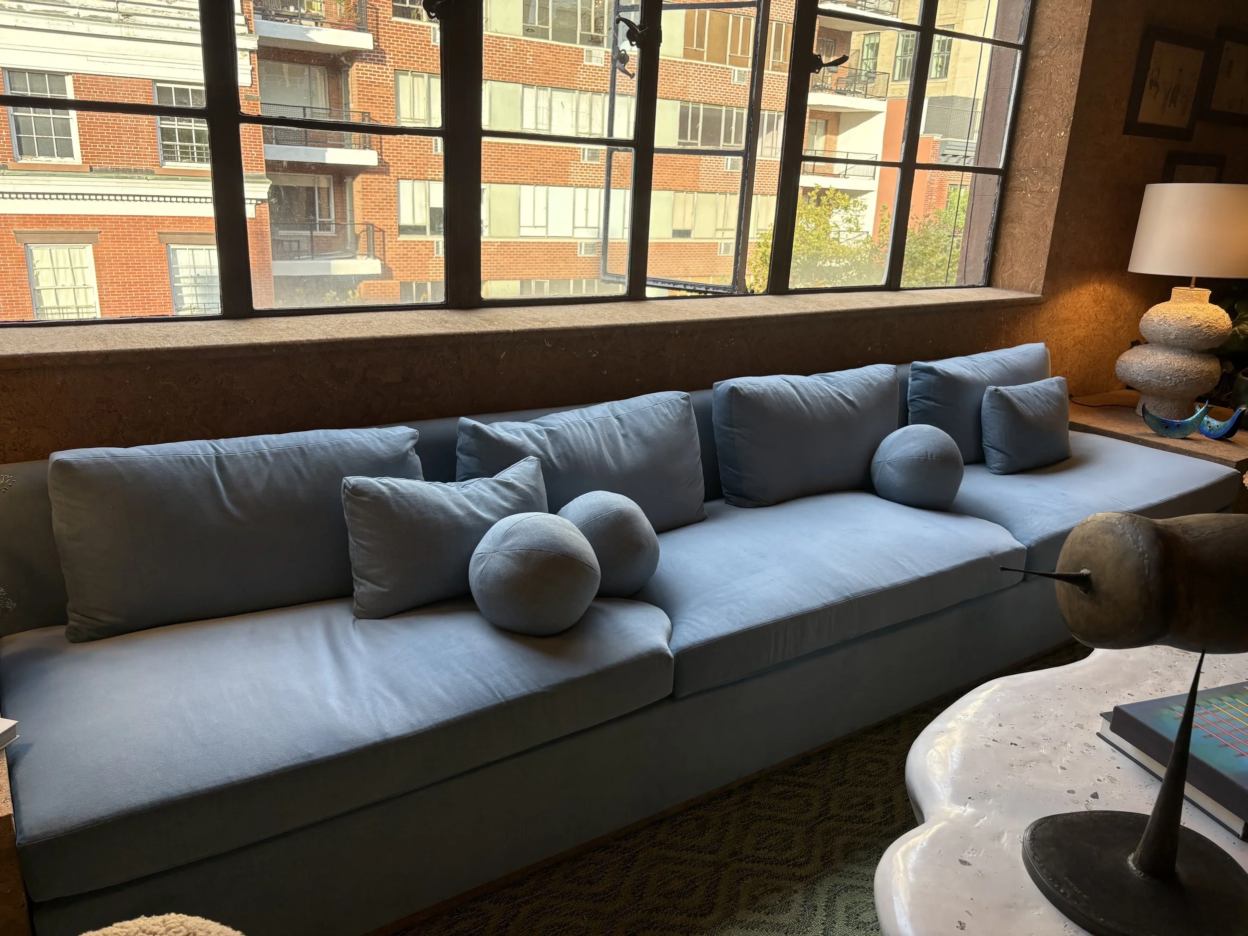 To incorporate both aesthetics, Huniford first wrapped the walls and ceiling in a gold-flecked cork from Phillip Jeffries, for a subtle tree-like vibe. He then selected a delicate sky-blue velvet to upholster the mammoth 23-foot built-in sofa he designed to run the length of one wall. In crafting the built-in side tables at the sofa’s ends, he says, “I was inspired by Mexican modernist designers like Clara Porset and Luis Barragán, who often integrated furniture directly into their architecture.”