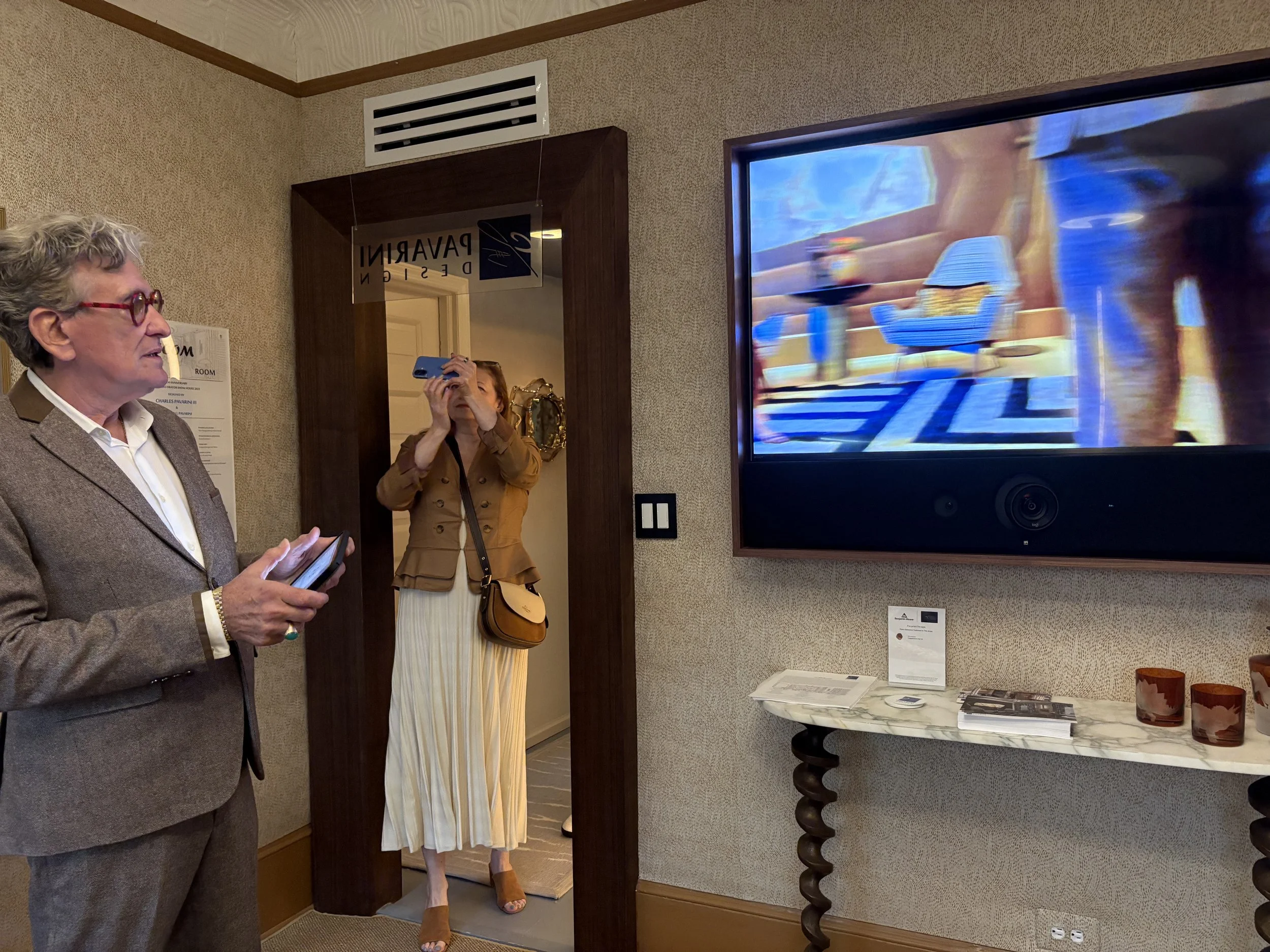 A tablet, connected to a high-resolution wall-mounted monitor and several cameras that follow you around the room, brings technology into the show house. It is fabulous. Bill Charney of Advanced Home Audio is the tech guru.