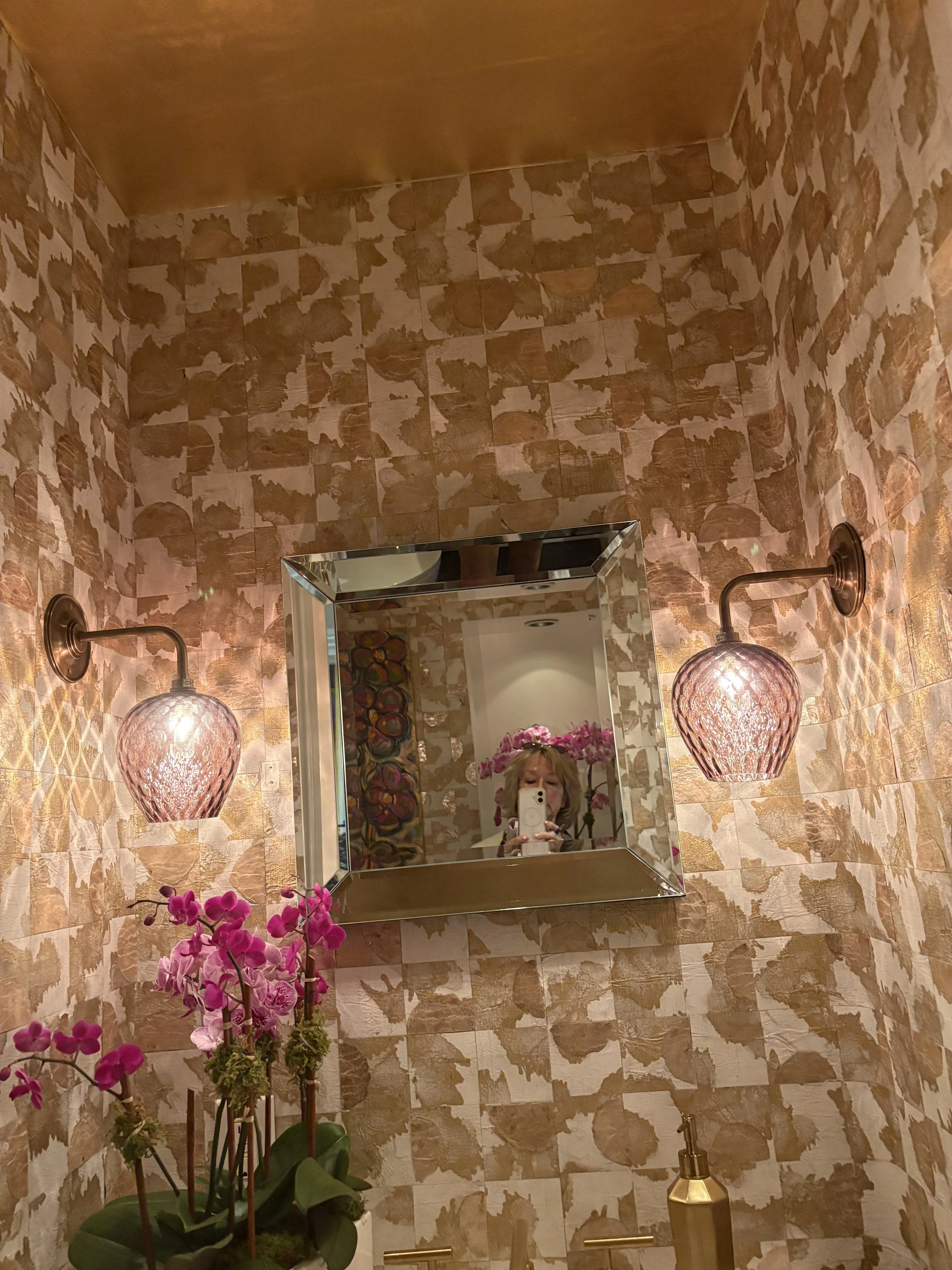 It seems Thomas just couldn’t help himself ~ as he also designed this nature-inspired loo. I really “took a shine” to his shimmery vanity and wallpaper.