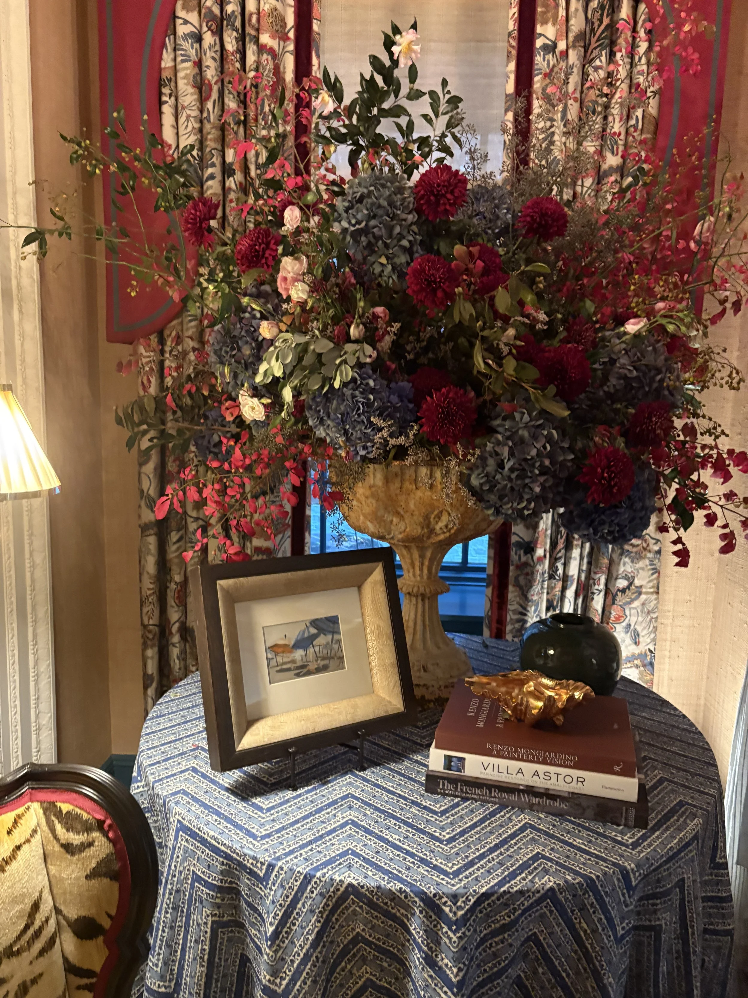 Plus, Thomas’s landing in the “ Painted Passage” is a rich tableau of fabrics and flowers. The Clarence House textiles silk velvet, and Zak and Fox - their Temari fabric is just the right mix of chic and fun, according to Thomas. Schumacher1889 and Cowtan and Tout created the window treatment fabrics.
