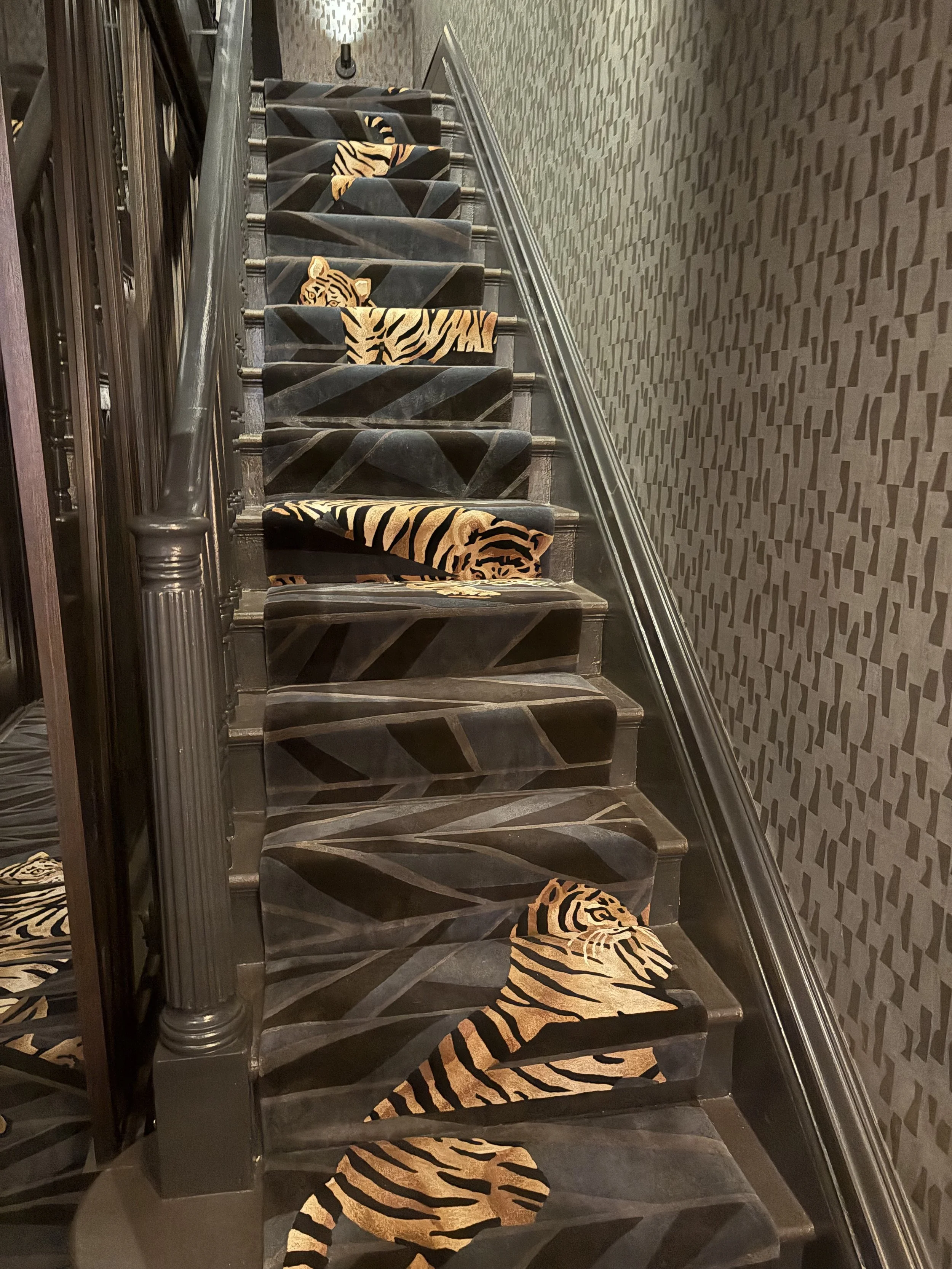 “Symbolising strength, courage and protection, the tiger appears throughout the entry in murals, passageways and on the staircase, hand-tufted in gradients of midnight, sapphire, and grey. ‘You can see the tiger peeping through the landscape,’ “Ovadia noted.
