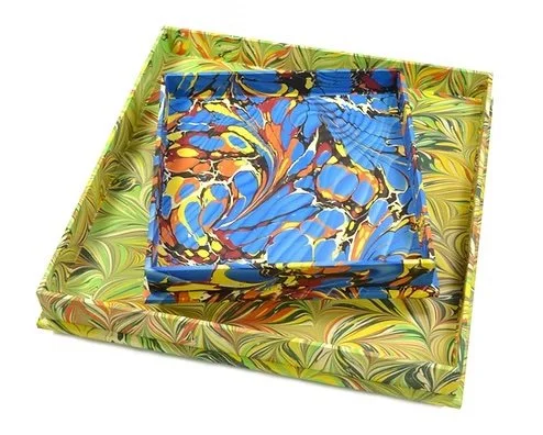 Paper wrapping objects. You’ve seen these marbleized designs. Here, in the Showhouse, the wraps were used in a number of rooms, including Hampton’s.