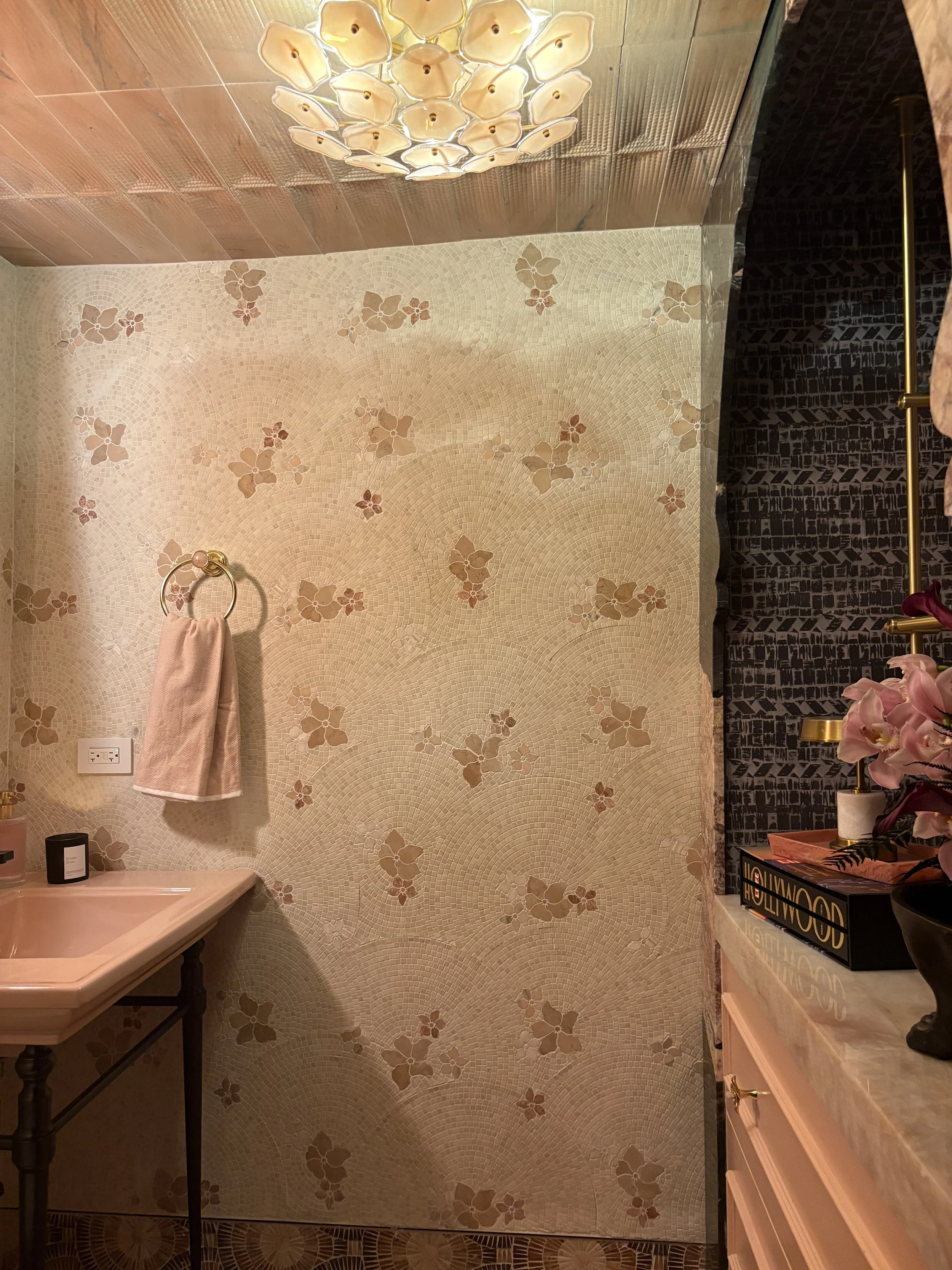 The hand-painted Gracie murals wrap the walls in dreamy botanicals. Their painterly presence is enhanced by the warm glow of antique decorative lighting from Carlos de la Puente and modern lighting from Visual Comfort & Co. Intricate moldings and stylish surfaces like the Botanic Green quartzite countertop by Artistic Tile add intrigue and depth. Even the ceiling is magnificent, covered in a swirling, ethereal wallpaper by Cat Alexander.