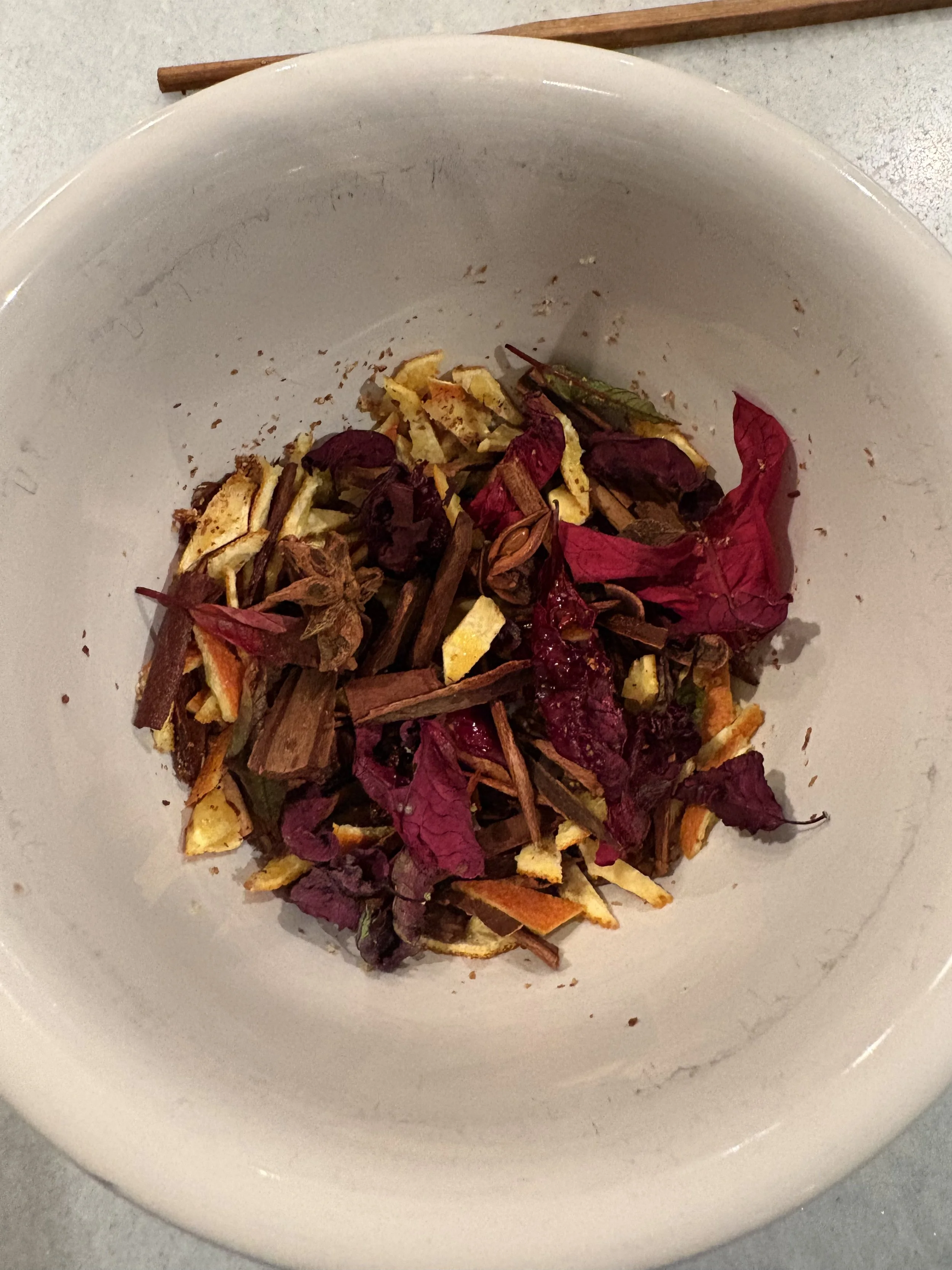 Next is the fun part. Mix the dried bracts with other natural plant ingredients like dried orange slices or cut up peels like I did ~ it’s citrus season, after all. Add in broken cinnamon sticks, star anise, and/or eucalyptus. I found you can also use small pinecones, especially if you are repurposing those from holiday decor, as well.