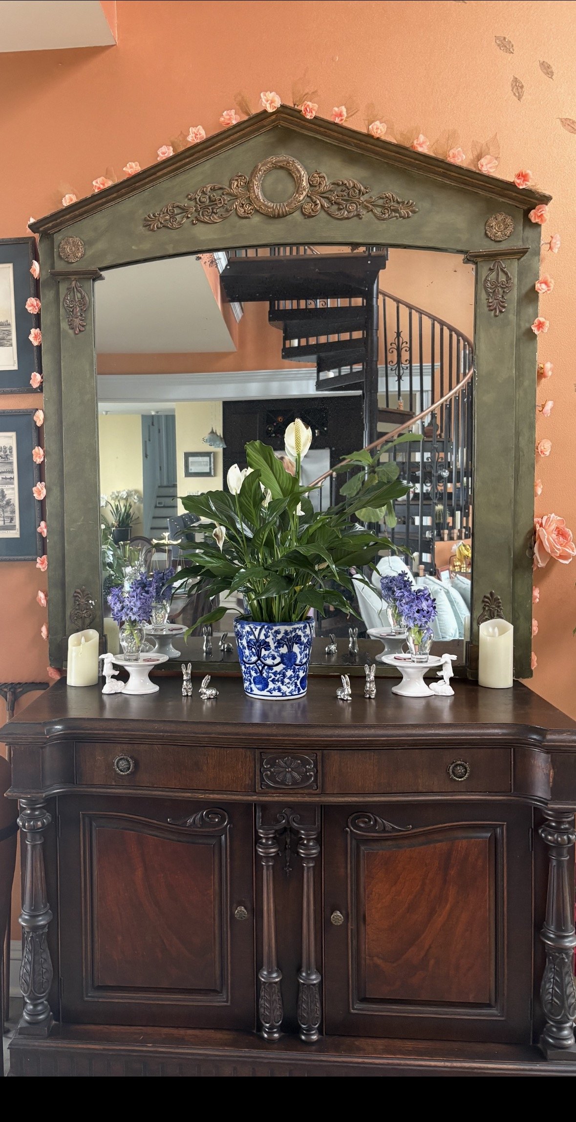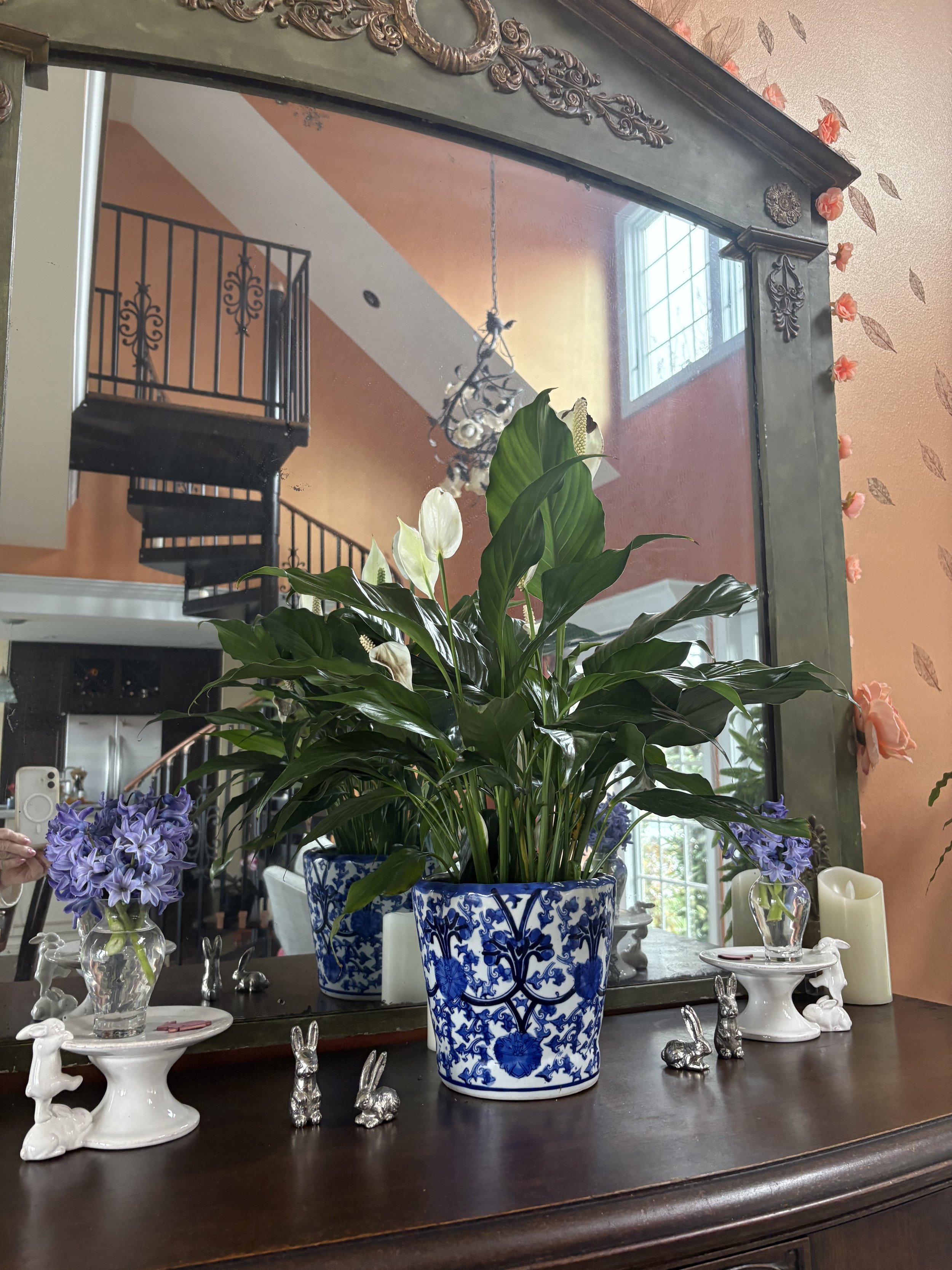 I’ve been cutting the purple hyacinths in my garden. The royal color and the intoxicating fragrance are irrisistable. These beauties and their heady sillage grace our antique sideboard, bookending the noble peace lily that centers it this season. You can view them elevated on the white bunny pedestals. So sweet for the springtime home decor.